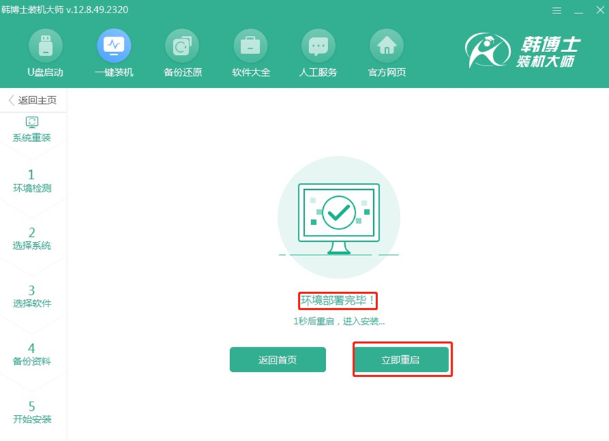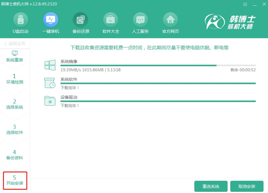 1.首先,訪問韓博士官網,下載并安裝“韓博士裝機大師”軟件,安裝完成后啟動,點擊“開始重裝”按鍵,按提示進行操作。