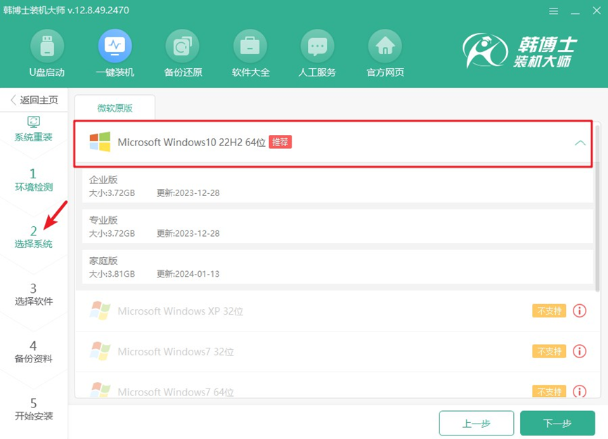 3.進入“選擇系統”界面后,系統會展示多個win10鏡像版本,您可以根據自己的需求選中合適的版本,點擊“下一步”,開始下載鏡像文件到本地電腦。