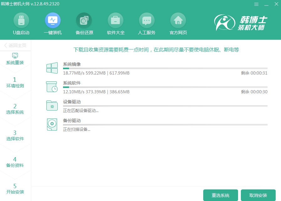 1.打開(kāi)韓博士官網(wǎng),下載裝機(jī)大師安裝程序,完成安裝后啟動(dòng)軟件,在界面上選擇“開(kāi)始重裝”,然后按照提示操作。