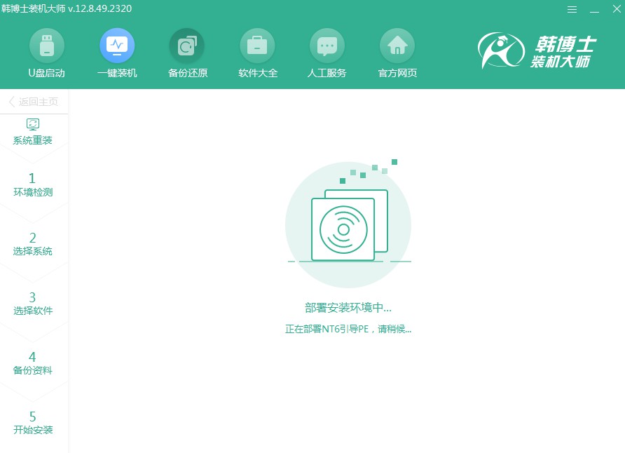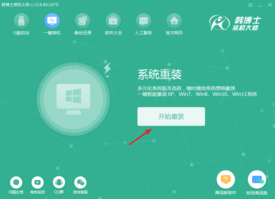 1.打開安裝好的韓博士裝機大師,點擊界面上的“開始重裝”按鈕,準備開始系統重裝。